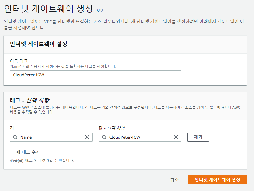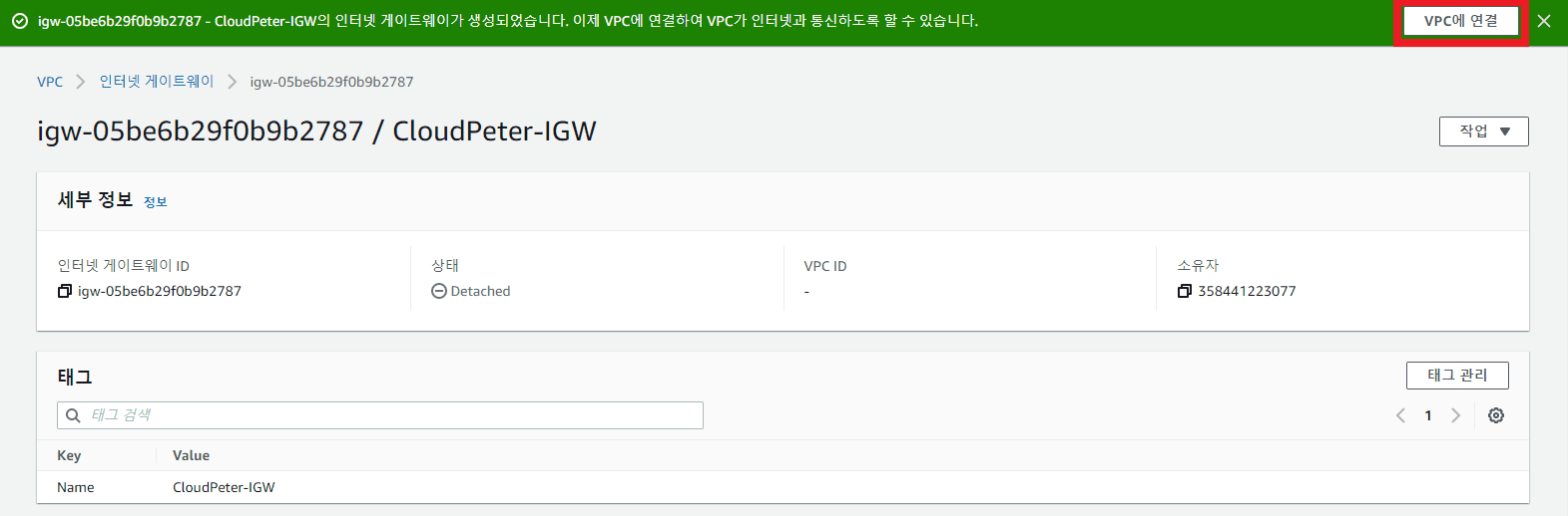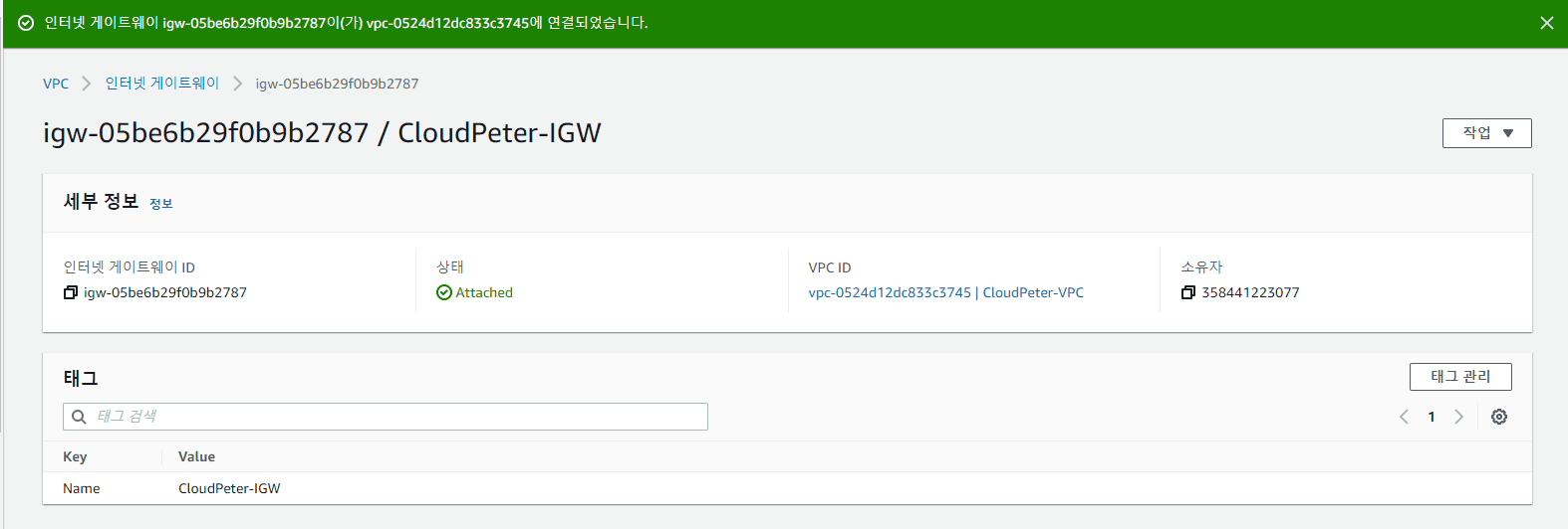 - 이름 태그: CloudPeter-IGW