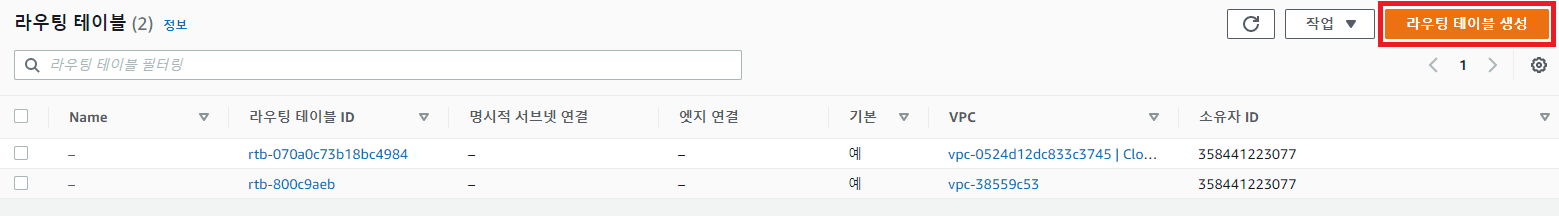 - VPC Console 접속 -> 라우팅 테이블